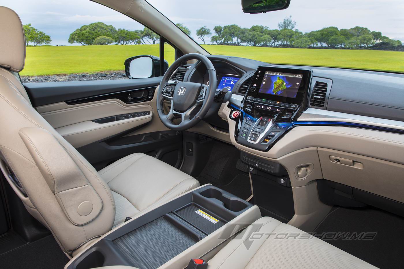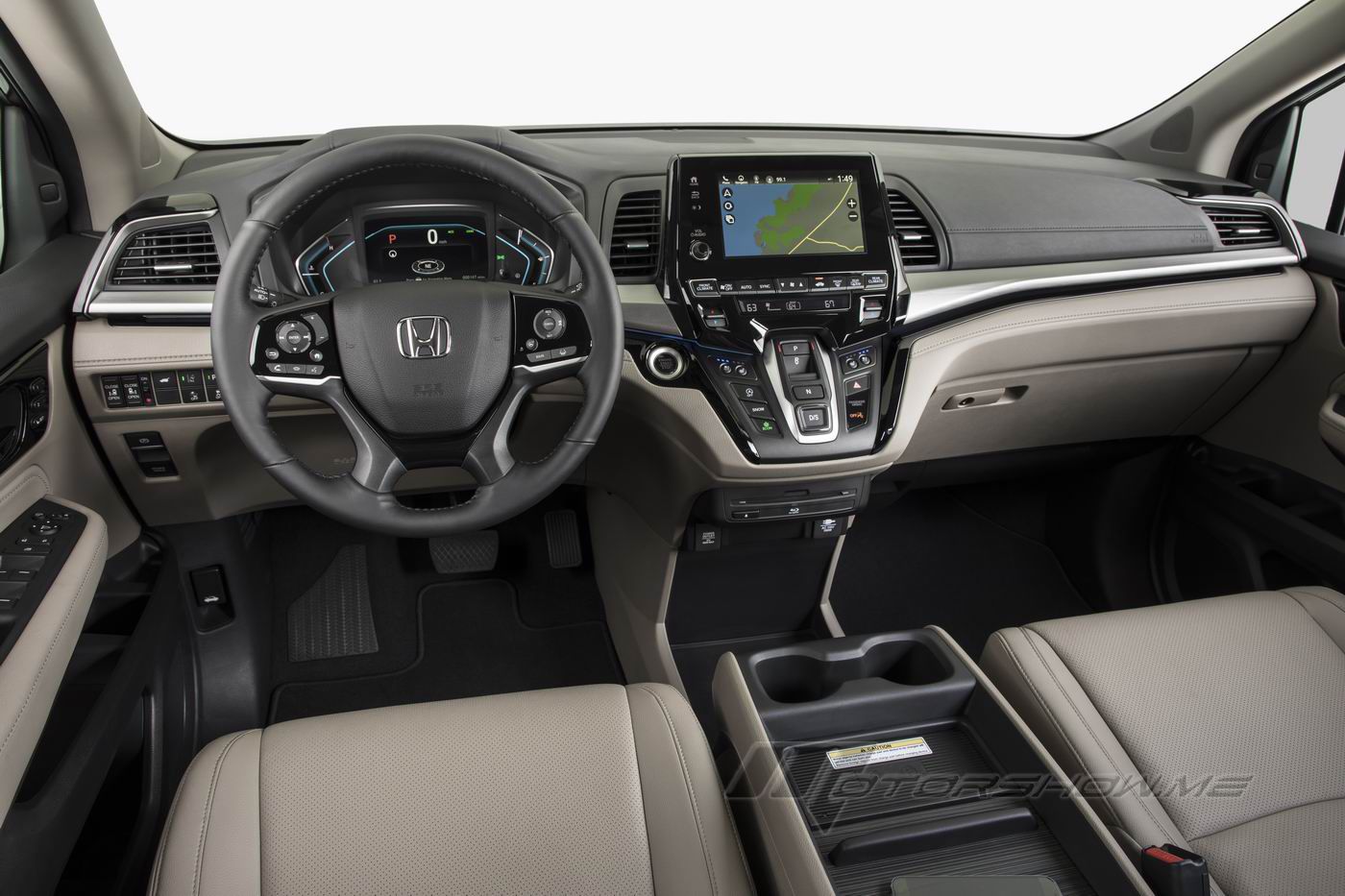 Inside, the new Odyssey features high-grade materials including a soft-touch instrument panel. The driver's meter features a new 7-inch, full-color TFT display, and in the center of the dash there is an available 8-inch high-resolution Display Audio touchscreen interface (EX and above). In upper grades, stain-resistant leather first- and second-row seating surfaces and door trim and black carpeting and black seatbelts are designed to conceal stains, while a new grooveless tambour lid on the spacious and versatile center console resists the accumulation of crumbs and debris.