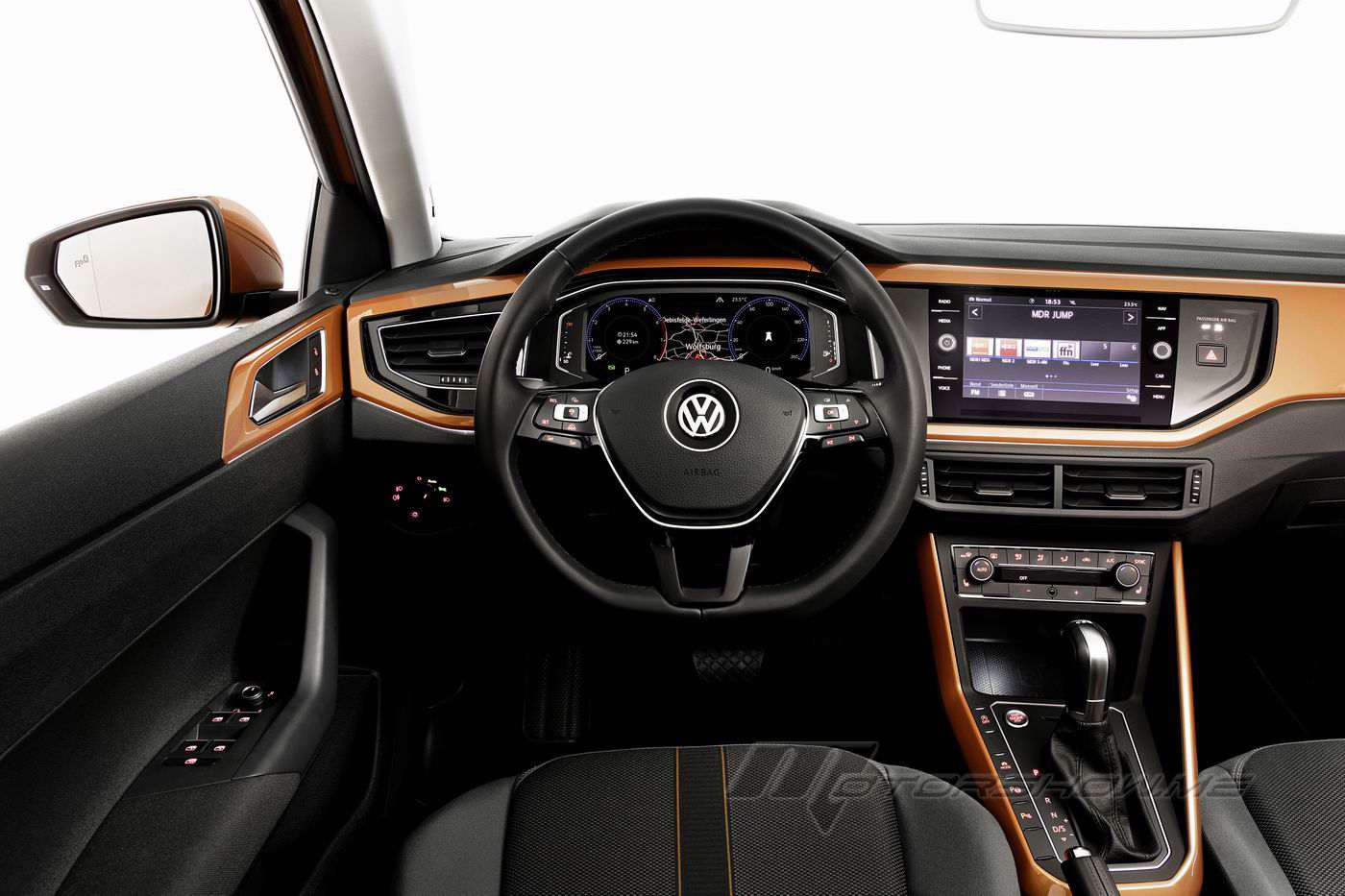 Avant-garde interior. Designers also gave the interior an expressive and avant-garde flavour. It is an interior without precedent, developed for the digital era. The Polo is the first car in its class to offer fully digital instruments --- the Active Info Display --- as an option. The instruments are arranged on the same viewing, with infotainment system displays up to 8.0 inches in size (which, on top versions, are glass-encased). Digital interfaces for smartphones allow easier access to their apps and various online services on board. Not only can smartphones be charged by wire, but also wirelessly (inductively) as an option. Interior dimensions of the sixth generation Polo are also much larger. As a result, the car offers more space for five occupants and a boot volume that has increased significantly from 280 to 351 litres.