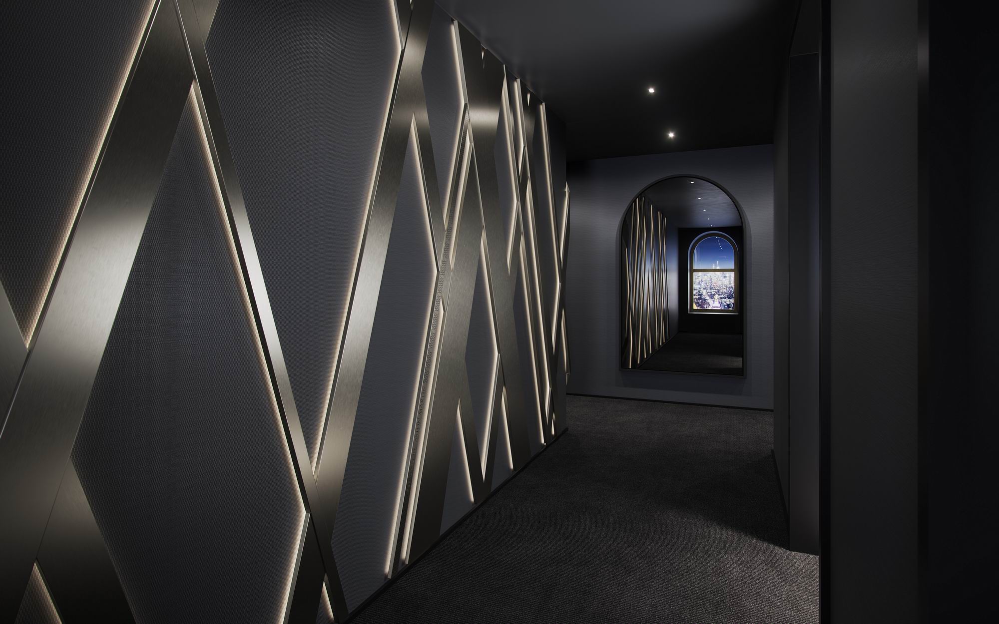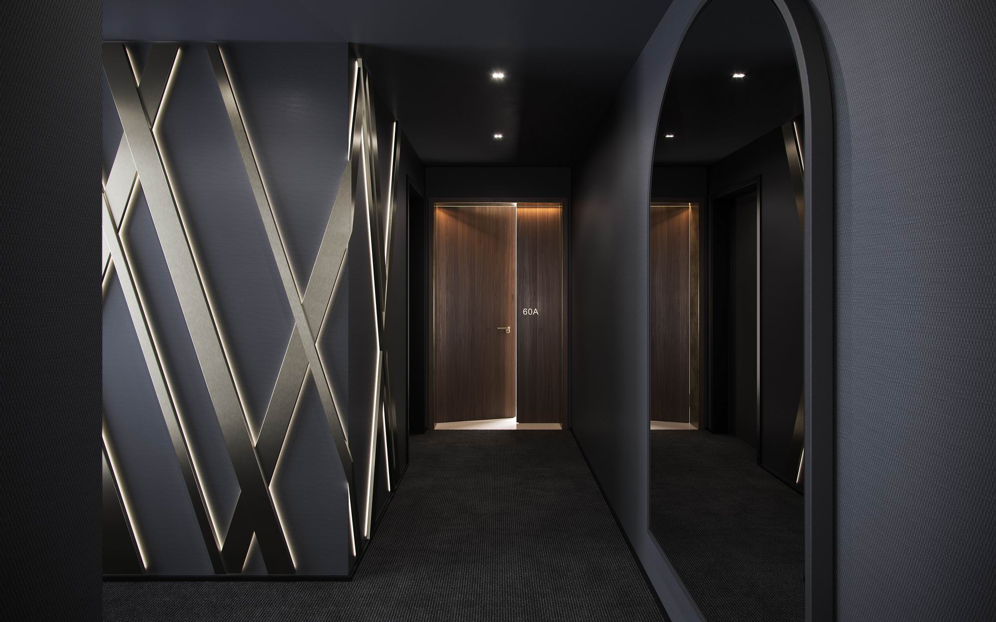 وعند خروج السكان من المصعد، ستكون باستقبالهم عناصر التصميم الداخلي المميزة التي تحمل نمط الخطوط المتقاطعة الخاص بعلامة أستون مارتن بتشطيبات برونزية. ويبرز ورق الجدران المميز من تصميم السير ديفيد أدجاي تحت هذه التفاصيل البرونزية المحببة، في حين تعكس مرآة الزجاج المغشّى التي أبدعها قسم التصميم في أستون مارتن منظر الأفق في شكل قوسيٍّ مميز يشير بوضوح إلى الأقواس التي تزين واجهة المبنى.