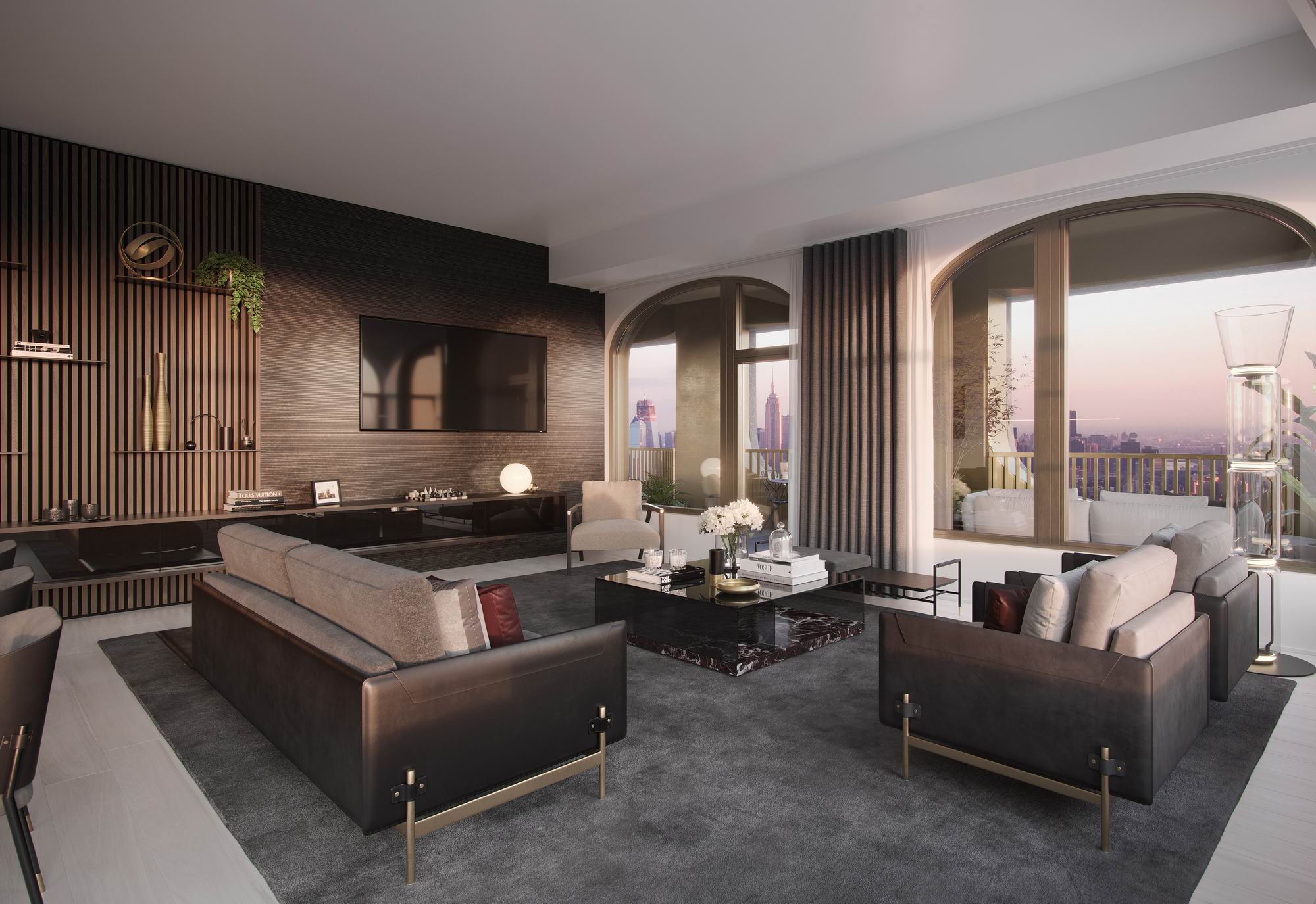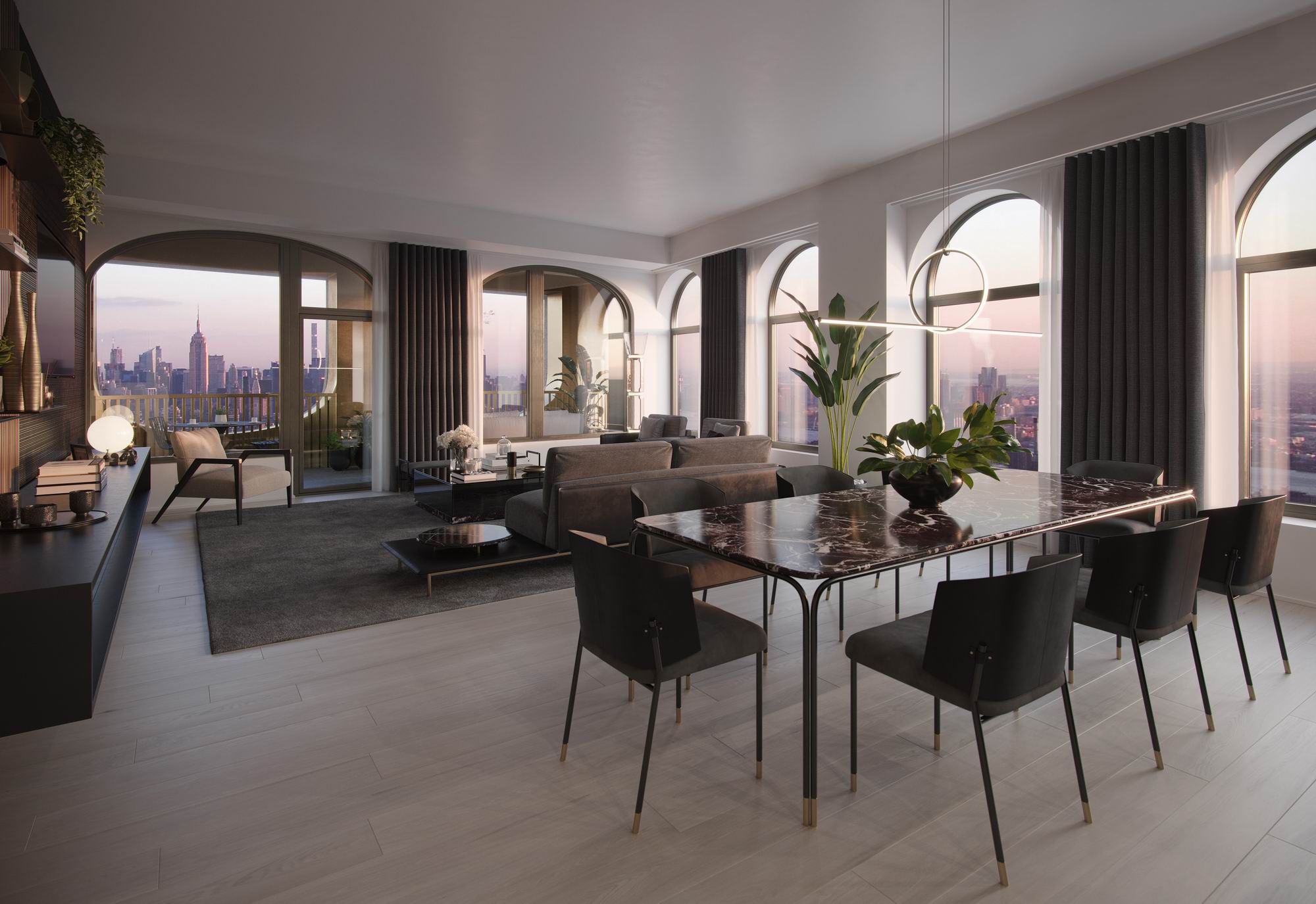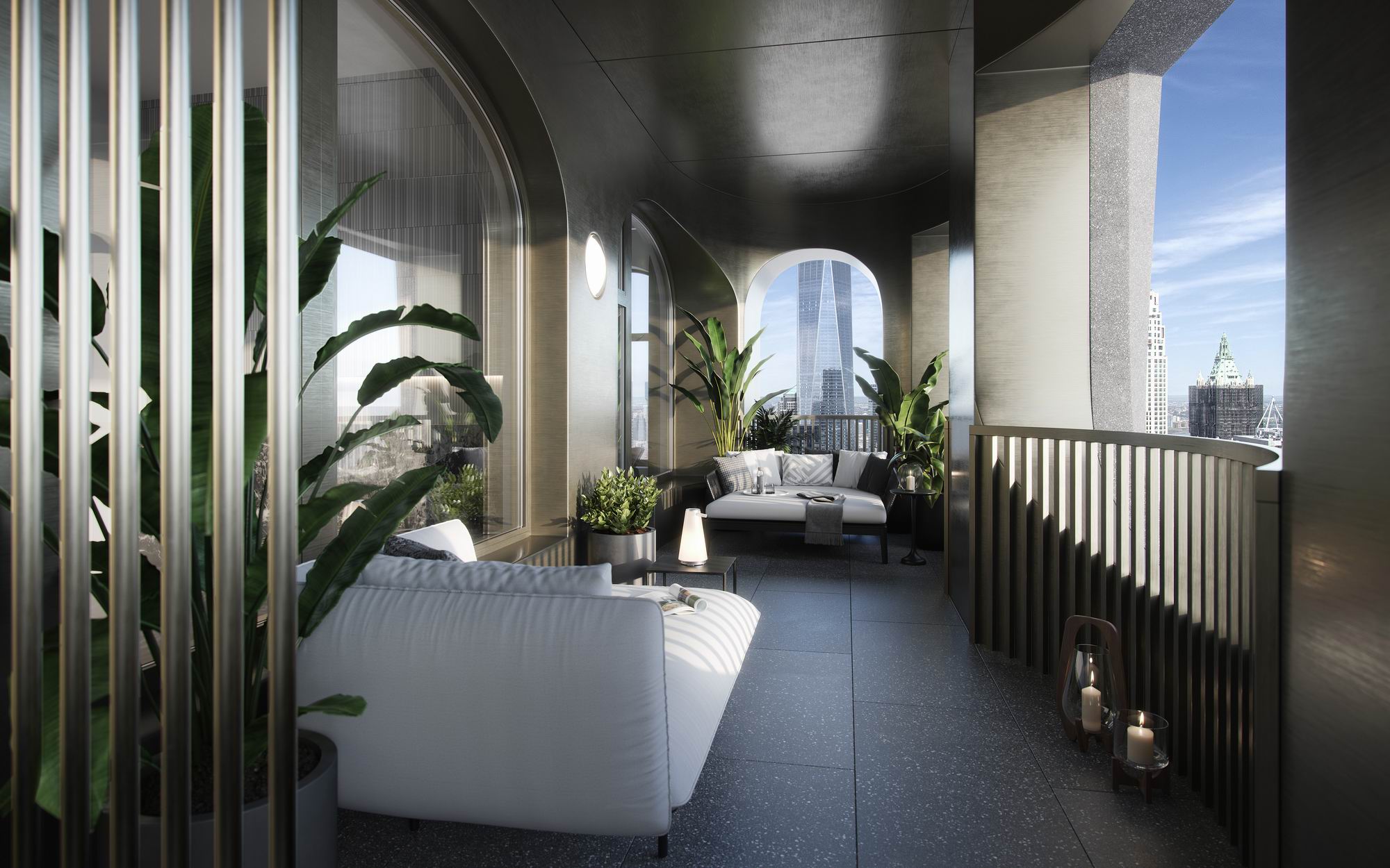 وتوفر غرفة المعيشة إمكانية الوصول المباشر إلى الرواق الخارجي لتمزج بذلك بين المساحات الداخلية والخارجية، وتمثل إحدى وسائل الراحة النادرة في مدينة نيويورك.