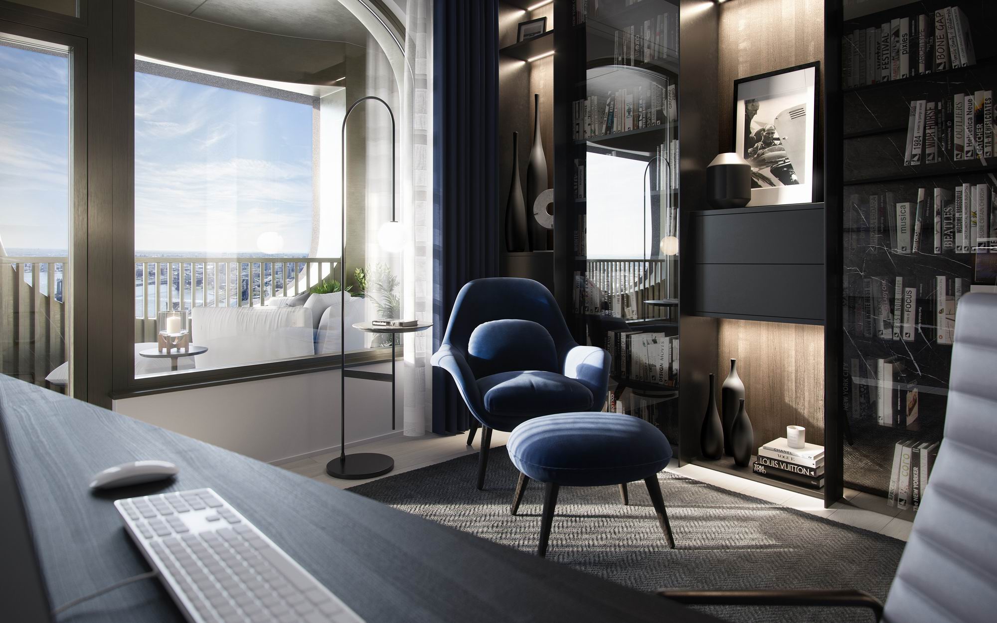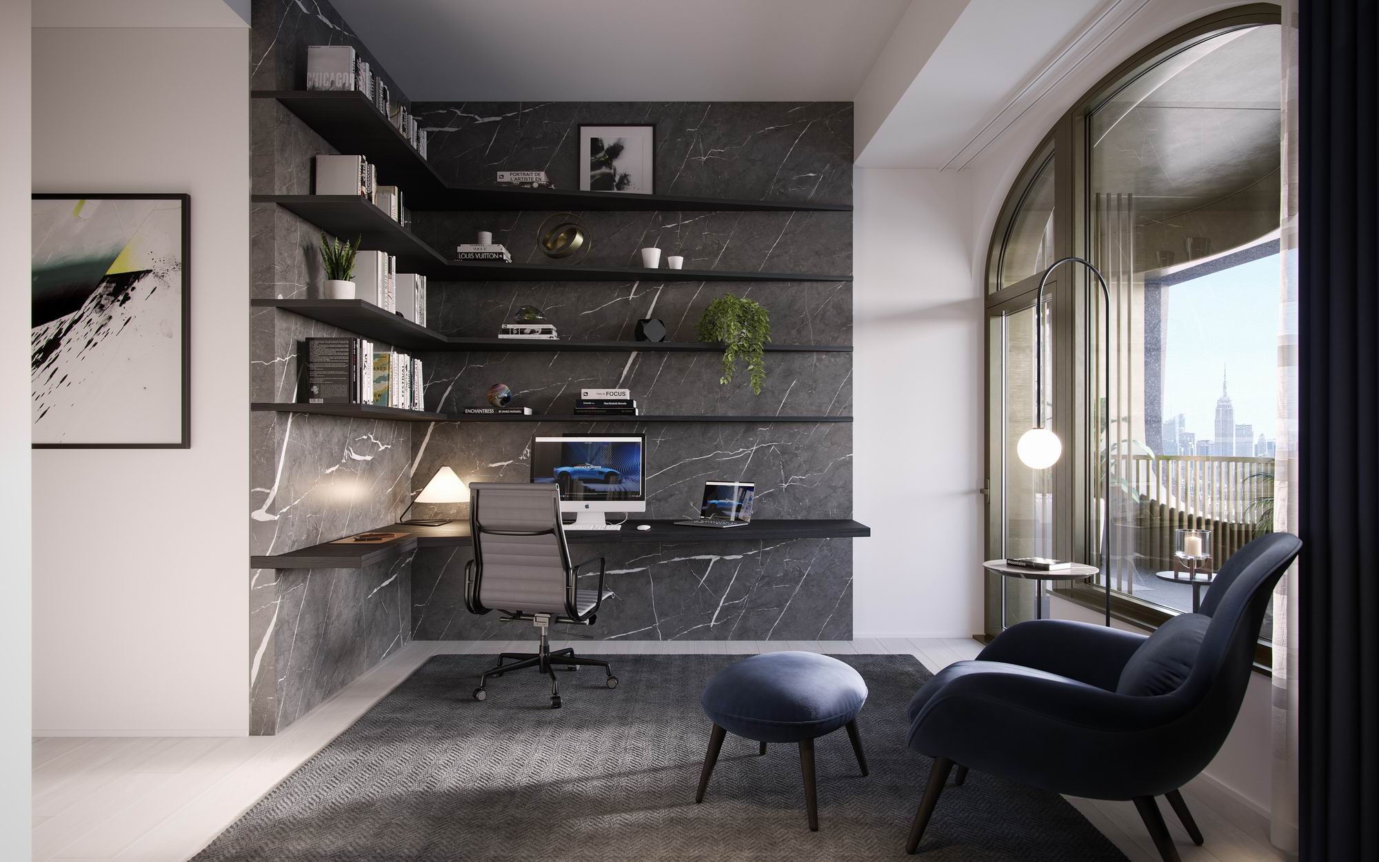 كما يمكن تحويل إحدى الغرف إلى مكتب خاص مع مكتبة مصممة للعمل والاسترخاء، وفق تصاميم بلمسات معاصرة وعناصر مخصصة. ويأتي المكتب المصمم خصيصاً لمنازل أستون مارتن مصحوباً بكرسي كلاسيكي من ايميس، كما تشتمل الغرفة على كرسي صالة من علامة سوون ومقعد خاص من علامة سبيس كوبنهاجن. ويوفر المكتب مساحات تخزين وعرض فسيحة، بما في ذلك الرفوف المصنوعة من الخشب الأسود والخزائن المزودة بالزجاج المدخن والمتواجدة بجانب الجدران المصنوعة من رخام سالفاتوري.