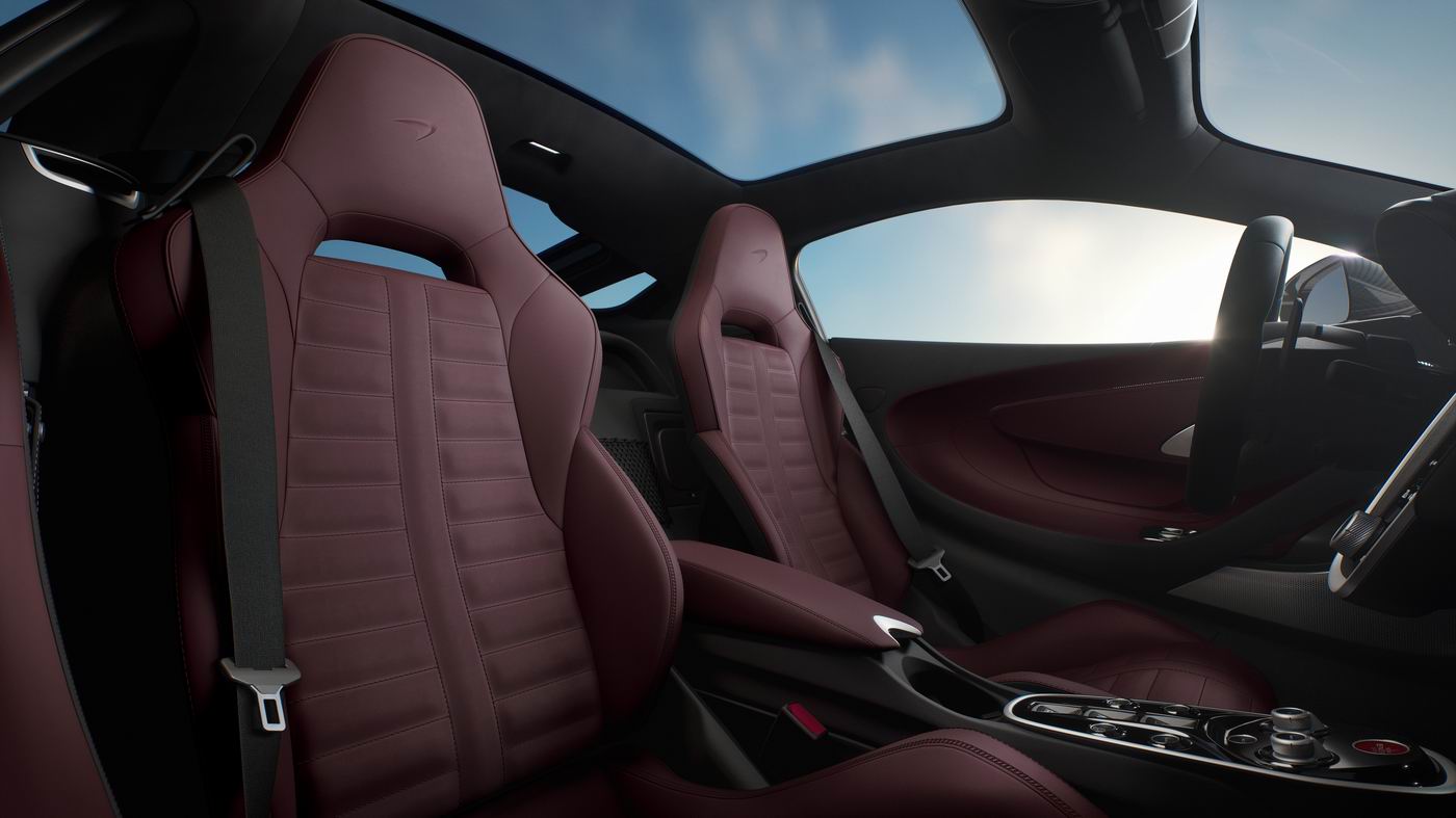 تتميّز المقصورة الراقية عالية الجودة بمزيج من المواد المختارة لتوفر أجواءً تجمع بين الأداء العالي والرفاهية. وتمّ توفير مفاتيح وأدوات تحكم من الألومنيوم المصقول والمفرز آلياً في المقصورة الداخلية، بما في ذلك مجاديف نقل الحركة المثبتة على عجلة القيادة، إلى جانب الإطارات السوداء اللامعة لشاشة المعلومات والترفيه، وصندوق التروس في الكونسول الوسطي، وأغطية فتحات التهوية، ومفاتيح النوافذ. وتشتمل حزم ألياف الكربون الاختيارية على مشبك عجلة القيادة بلمسة نهائية من الكربون وأذرع نقل الحركة، واللمسات الداخلية وتشطيبات العتبات التي تحمل علامة ماكلارين التجارية.