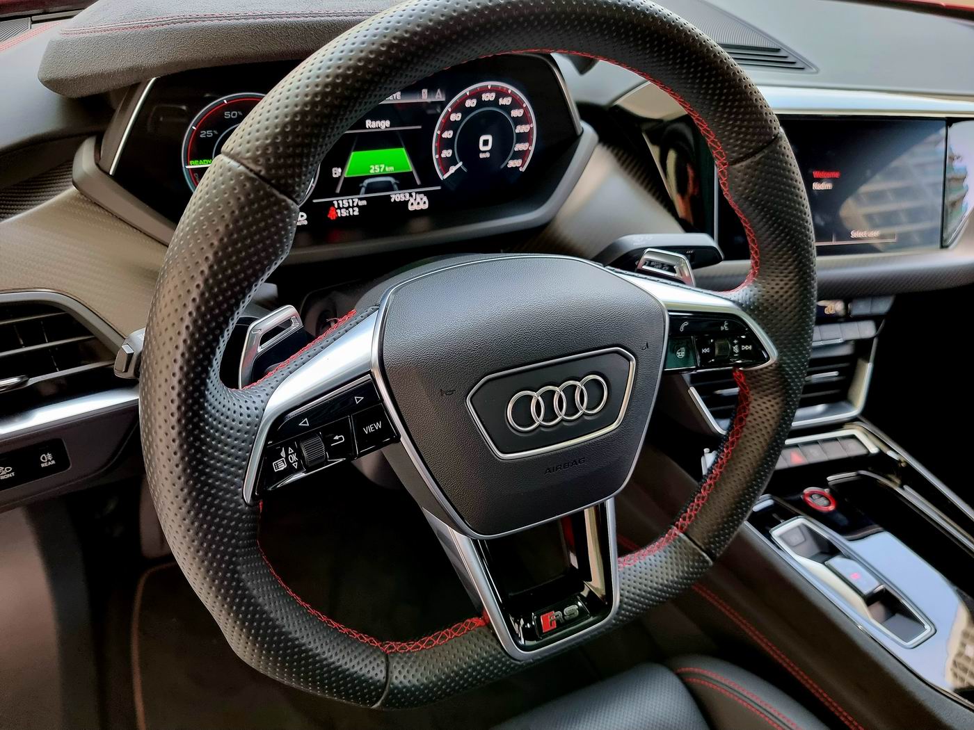 The RS e-tron GT is not just about raw power, it’s engineered for precision and control. It features adaptive three-chamber air suspension, which continuously adjusts ride height and damping based on road conditions and drive mode. Rear-wheel steering improves low-speed agility and high-speed stability, while Audi Drive Select allows the driver to choose from several modes (Comfort, Efficiency, Dynamic, and Individual) that fine-tune throttle response, suspension stiffness, and steering weight. Regenerative braking is adjustable and works in tandem with the mechanical brakes to recover energy while maintaining smooth deceleration. In higher trims, carbon-ceramic brakes are available for even greater stopping power.