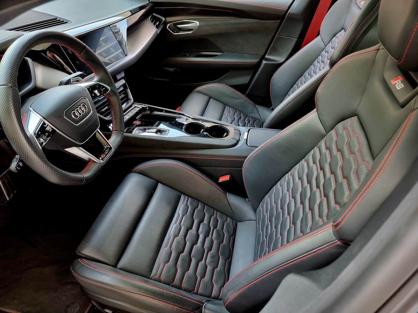 Inside, the RS e-tron GT offers a driver-focused yet luxurious environment. The cabin features Audi’s Virtual Cockpit Plus, a 10.1-inch MMI touchscreen, and haptic controls integrated into a clean, horizontal dashboard layout. The interior materials include leather, Alcantara, and optional Dinamica (a microfiber made from recycled materials), underscoring Audi’s sustainability goals. Sport seats are standard, with ventilation, massage function, and multi-way adjustability available. The steering wheel is RS-specific, with a flat bottom and perforated leather grips, and ambient lighting sets the tone for night driving.