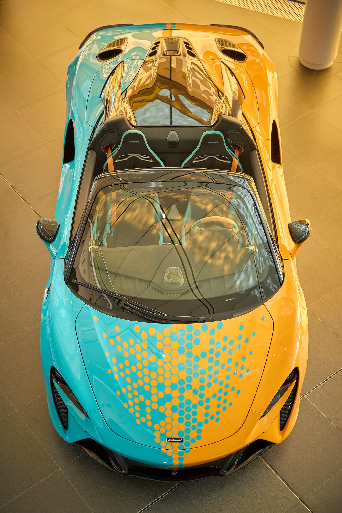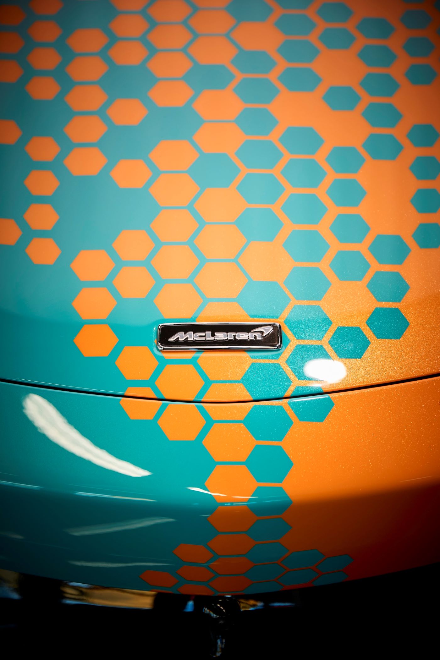 يأتي الطلاء الخارجي بمزيج من اللونين Tokyo Pearl وPapaya Spark ضمن أسلوب طلاء متدرج يعتمد تقنية Velocity Fade من قسم MSO، ويبرز تدرجات لونية معقدة مستوحاة من تصميم سداسي الشكل يرمز إلى بنية ألياف الكربون المستخدمة في سيارات ماكلارين. كما يشمل النمط السداسي عناصر المقصورة الداخلية مثل الأبواب وعجلة القيادة المصنوعة من جلد الكنتارا ثنائي اللون، بالإضافة إلى تفاصيل أخرى مثل مكابح العجلات التي تحمل اللونين على جانبي السيارة.