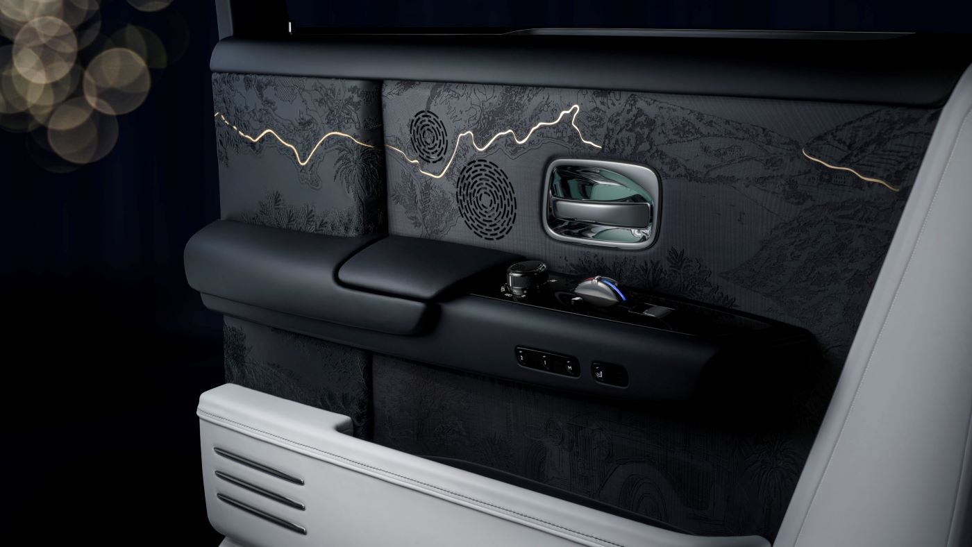 This complex fabric was developed over 12 months in partnership with a fashion atelier, marking its first commission beyond the world of haute couture. To meet Rolls-Royce’s exacting longevity, tactility and aesthetic standards, the high-resolution printing process was perfected with specially adapted inks and techniques devised exclusively for the Phantom Centenary Private Collection. The high-resolution printed fabric is completed with embroideries, designed to have a uniquely hand-drawn quality.
