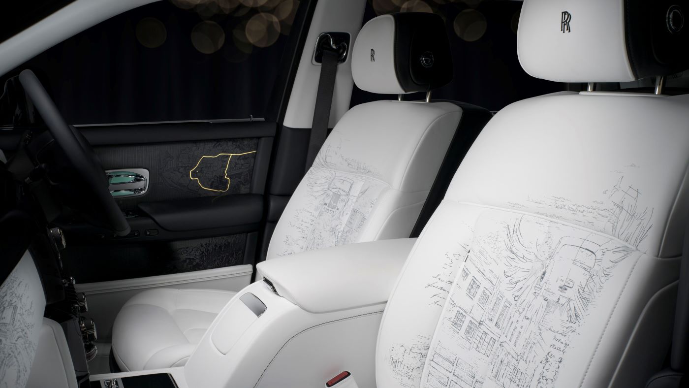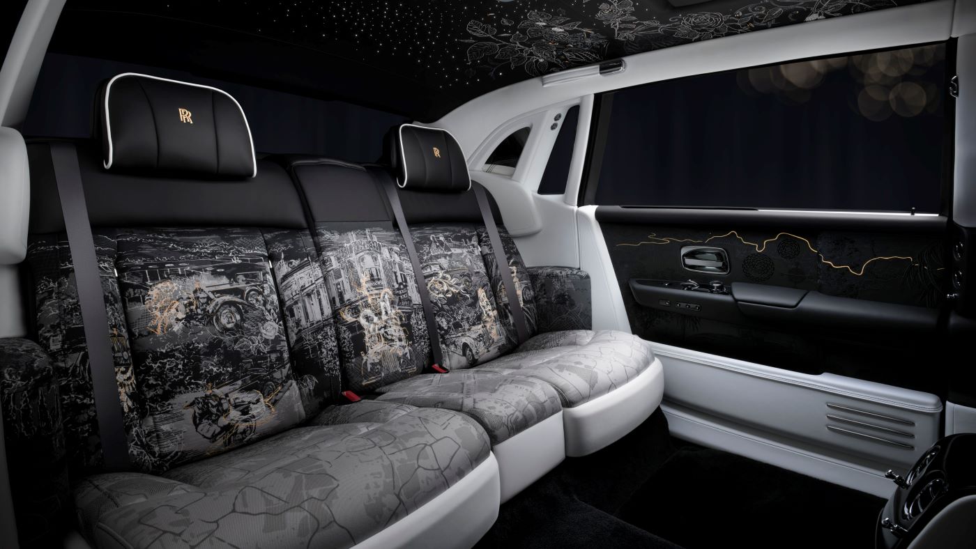 The rear seats of Phantom Centenary are inspired by the famed 1926 ‘ Phantom of Love, commissioned with handwoven Aubusson tapestries. The artwork on the seats unfolds across three distinct layers of storytelling. The first is the background, rendered in high-resolution print, showing places and artefacts from Phantom’s history – from the marque’s original Conduit Street premises in London to Henry Royce’s oil paintings of Southern France. The second layer, also printed in high resolution, portrays great Phantoms of the past in finely drawn detail. The third and uppermost layer is formed of embroideries, abstractly representing seven significant owners from every generation of Phantom.