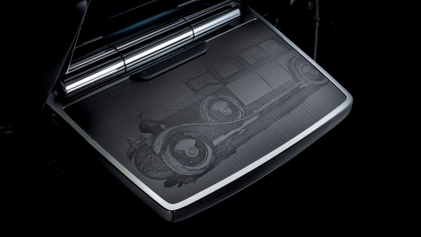 The wooden surfaces on the doors transform into masterfully embroidered leather panels. The 24-carat gold ‘roads’ continue as golden thread embroidery; details of the maps and landscapes are stitched in black, echoing the etched details on the veneered section of the doors. The woodwork is completed with depictions of the original 1925 Phantom I and the current Phantom VIII, individually etched on the rear picnic tables. The models are mirrored in embroidery on the leather-finished backs of the picnic tables – another gesture uniting past and present. The Piano Black veneer is infused with gold dust, echoing the central rotary dial, also plated with 24-carat gold.