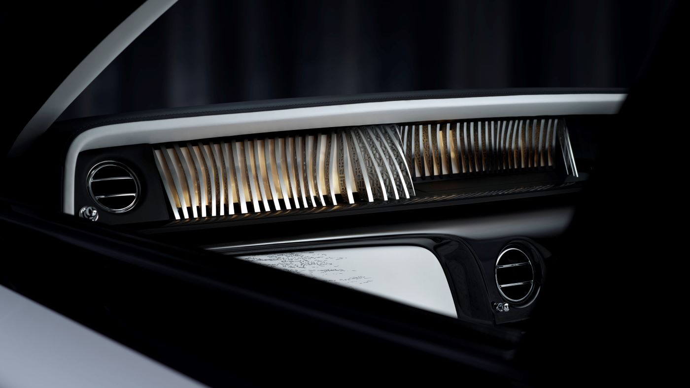 The centrepiece of the Phantom Centenary Private Collection is the Anthology Gallery. This dramatic composition features 50 3D-printed, vertically brushed aluminium ‘fins’ interlaced like pages of a book. Each fin is composed of sculpted letters that can be read from both sides, forming quotes drawn from a century of press acclaim. The sculpture is subtly lit by shifting illuminations that recall the shimmer of falling fireworks. The brushed edges of each fin create a play of reflections, changing with the viewer’s moving perspective.