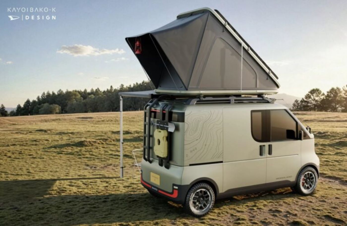 أما نسخة التخييم، فجهّزت بخيمة سقفية قابلة للفتح وسلّم خلفي ومظلّة وطاولة وكراسي متنقلة، إضافةً إلى عجلات مخصصة للطرق الوعرة وشريط إضاءة على السقف، ما يجعلها مثالية لعشاق المغامرات. وتشير تفاصيل التصميم إلى أنها كهربائية بالكامل وقد تمهّد لبديل مستقبلي لطراز أترَي (Atrai) الشهير.