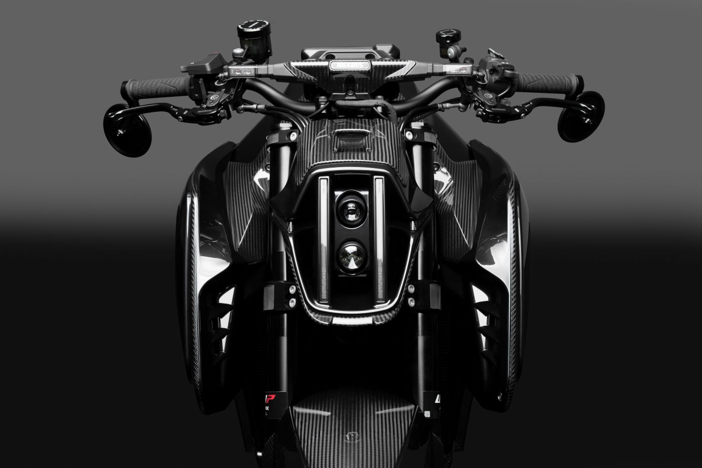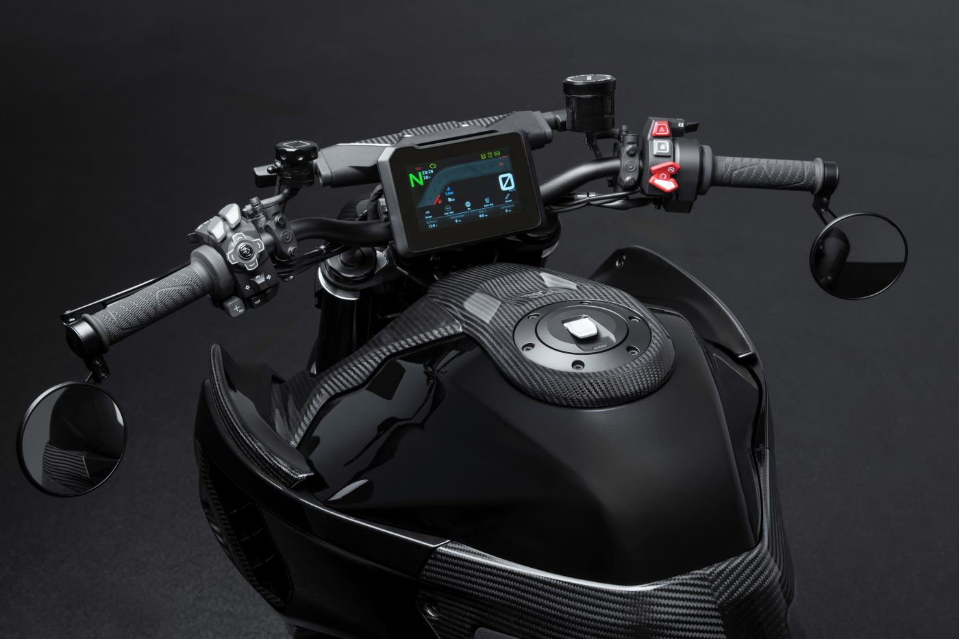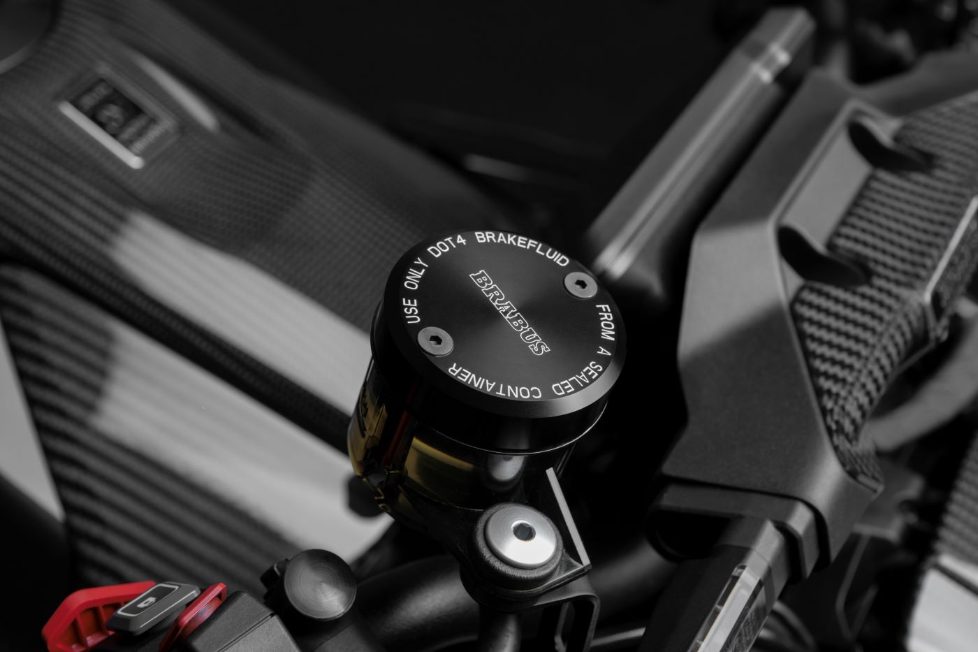 The front view impresses with the BRABUS fender and the tailor-made carbon mask with a special LED headlight unit and a unique daytime running light signature inspired by the BRABUS signature stripes. The BRABUS WIDESTAR side spoilers with sporty carbon accents not only emphasize the dynamic profile, but also give the motorcycle a powerful visual character. The design of the custom fuel tank fairing, likewise made of exposed-structure carbon fiber, with integrated Dinamica pads on the left and right, adds a unique touch of elegance. Further carbon highlights include the side fairing elements, the ignition lock cover and the belly pan.