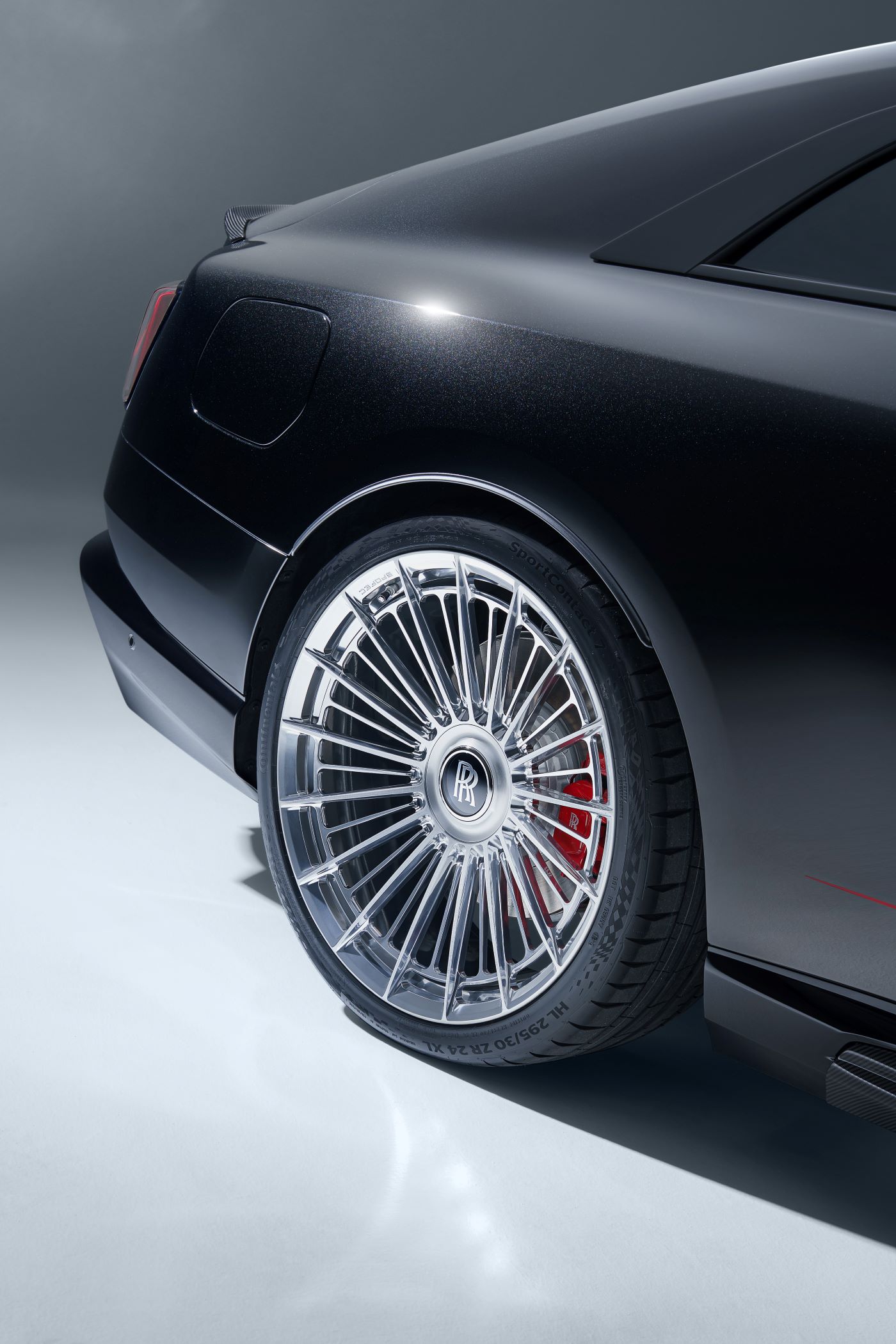 The Black Badge Spectre also shows even stronger character in the side view thanks to the SPOFEC enhancement. The visible-carbon rocker panels give the Spectre a lower and sleeker visual stance. Above all, the giant 10Jx24 SPOFEC SP4 wheels all around are what stand out. Tires of size 295/30 ZR 24 were chosen as the optimal solution for the front and rear axles.