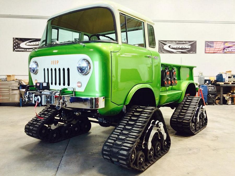 هذه الشاحنة الضخمة هي سيارة جيب FC-170 البيك أب موديل 1958 التي تأتي بعجلات مجنزرة وطلاء أخضر.
