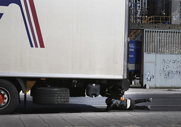 أحد المهاجرين الغير شرعيين في محاولة لعبور الحدود اليونانية بالتخفي أسفل شاحنة.