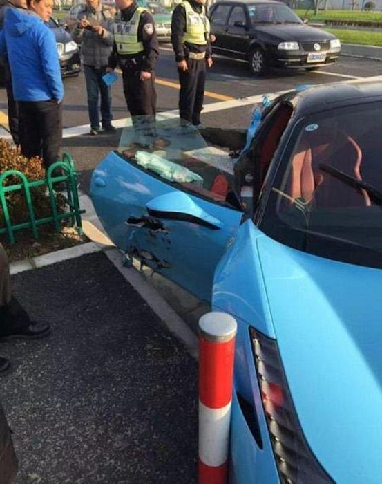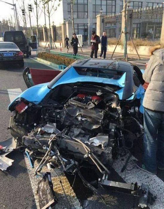 وقعت حادثة مؤسفة لمواطن صيني أدّت الى تحطيم سيارته الفارهة بشكل كبير في مدينة شنغهاي. حطم الشاب مالك السيارة وهو في العشرينيات من العمر سيارته الجديدة من نوع فيراري 458 ايطاليا التي تبلغ قيمتها 2.2 مليون ريال سعودي بعد ان تأخر عن عمله فاستقل سيارته في الصباح الباكر وقادها مسرعا علّه يصل في وقت أبكر لكنه فقد السيطرة على سيارته واصطدم بعمود انارة على الطريق ما أدى الى الاصطدام مرة أخرى بسيارة من نوع فان ولحسن الحظ لم يتعرّض الشاب لاي أذى اما الاضرار فاركزت على الماديات.