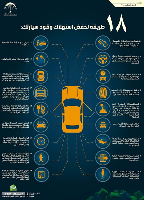نشرت جمعية حماية المستهلك السعودية 18 طريقة لخفض إستهلاك وقود السيارة، يأتي ذلك بعد القرار الأخير من الديوان الملكي السعودي برفع أسعار البنزين في السعودية، هذه الطرق و الأساليب من شأنها أن تقوم بخفض إستهلاك وقود السيارة ما سينعكس بشكل إيجابي على المستهلك للمحافظة على مصروفه الشهري على السيارة حتى بعد تغير الأسعار الأخيرة.