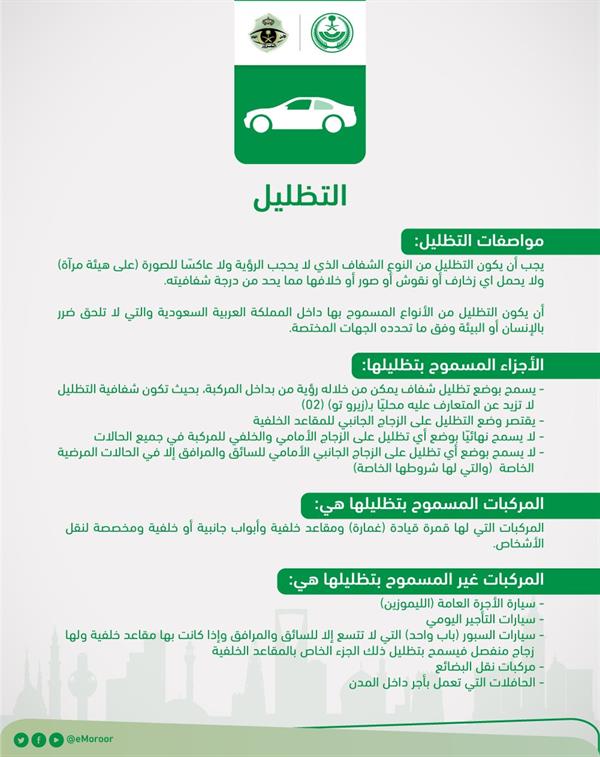 نشر المرور السعودي على صفحته الرسمية عبر تويتر لائحة بأنواع ومواصغات التظليل المسموح باستخدامها في المملكة العربية السعودية: