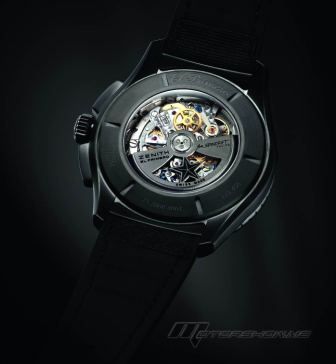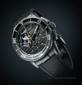 كرونوغراف اوتوماتيكي مع عجلة مسننة عمودية وإطار دوّار حركة مع فتحة تكشف عن جهاز للضبط